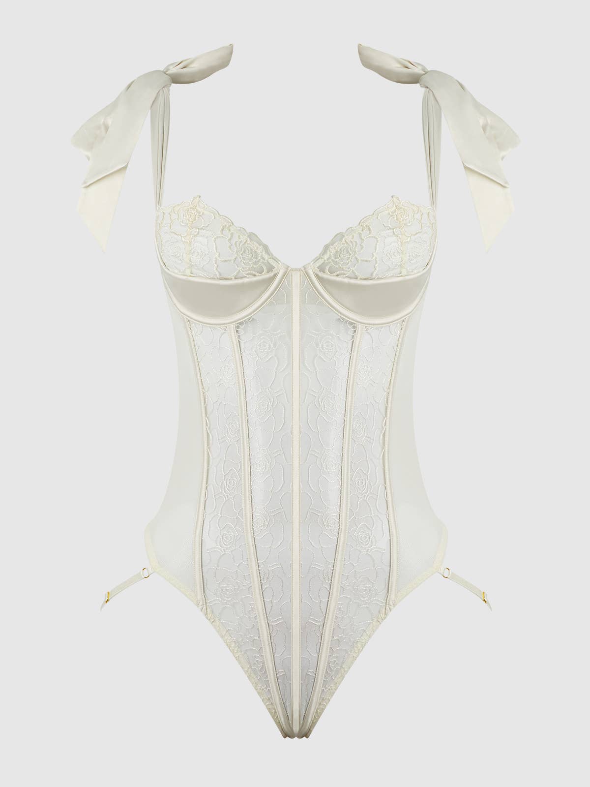 Product Details: - Crafted in mesh with a waist-defining front panel in embroidered lace. - Sheer half-cups edged in scalloped lace with shoulder ties. - Cutout on the back with adjustable criss-cross detail. - Thong back bottom with draping straps. - Fit flexible set with adjustable straps.