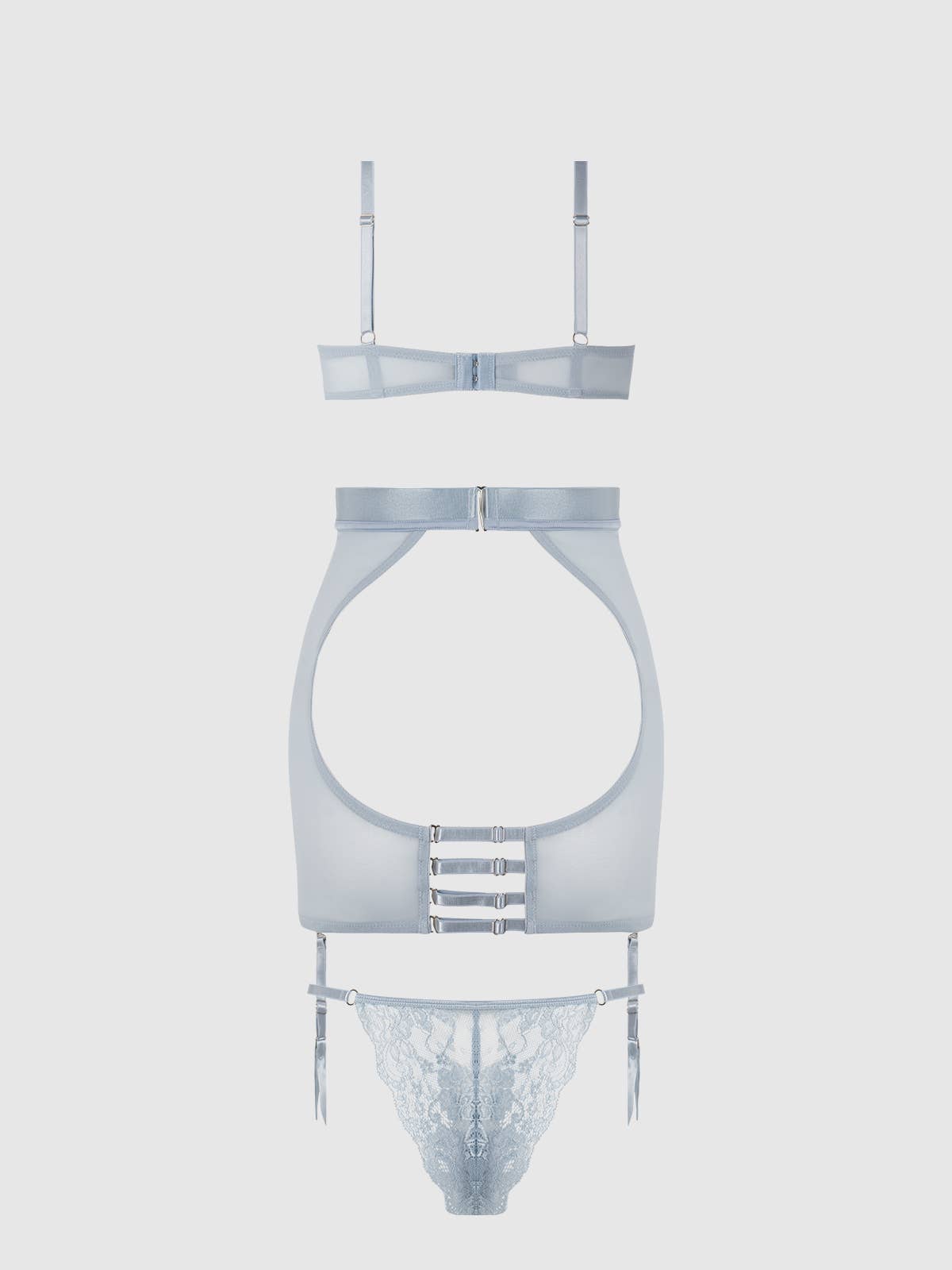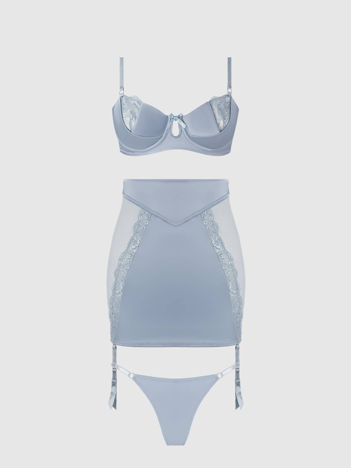 Product Details: - Balconette bra with underwire support and keyhole detail. - Skirt features satin, stretch mesh and lace with garters that are adjustable and removable. - Bold backless skirt design with adjustable under-bum sliders for a snug fit. - Low-rise, tanga cut with soft satin front and stretch lace back. Flexible side sliders for adjustability. - Set is fit flexible with stretch mesh throughout, adjustable hook & eye closures and adjustable sliders.