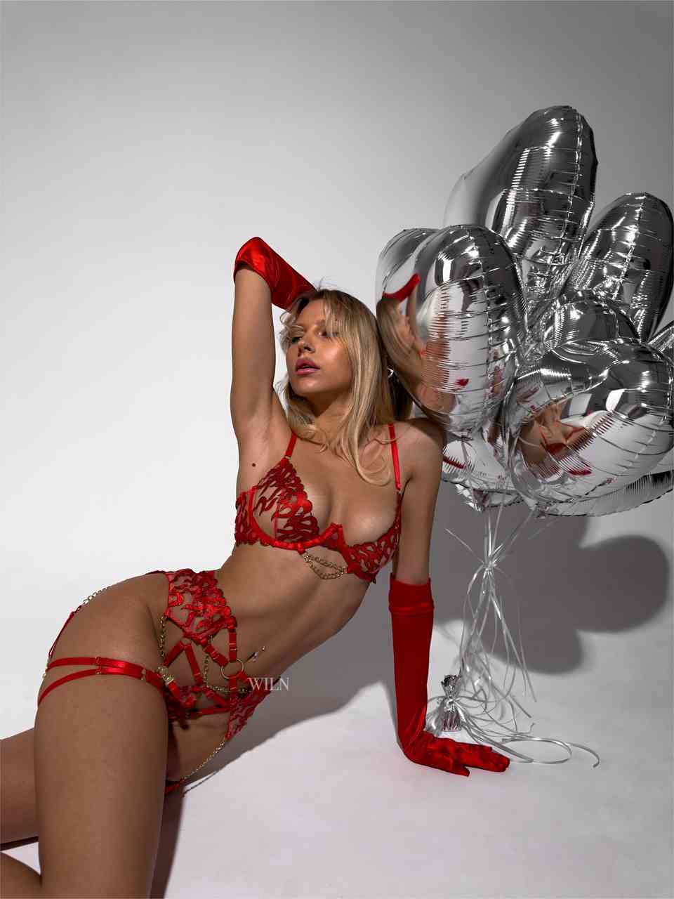 Bra, garter belt, thong, satin gloves