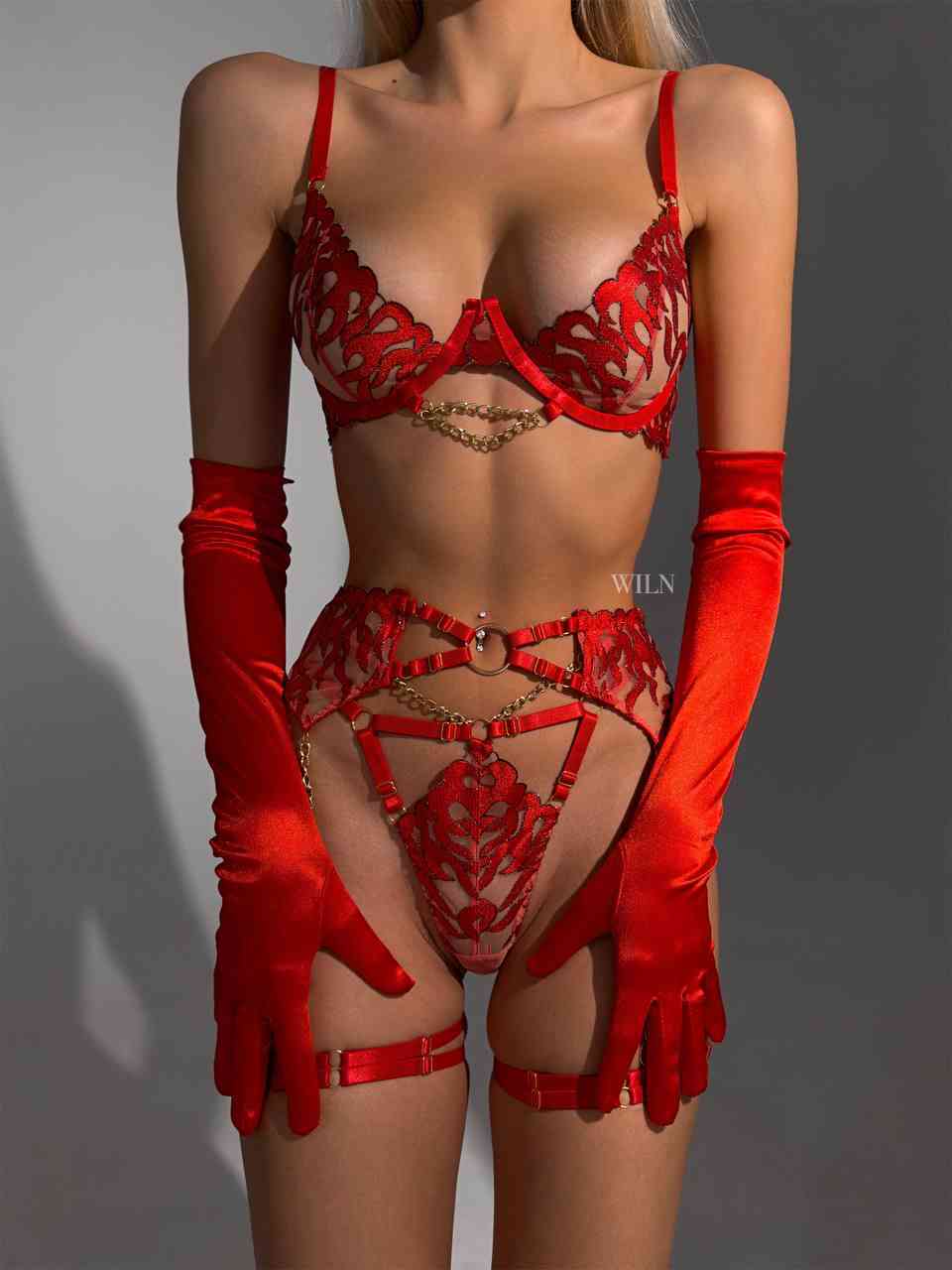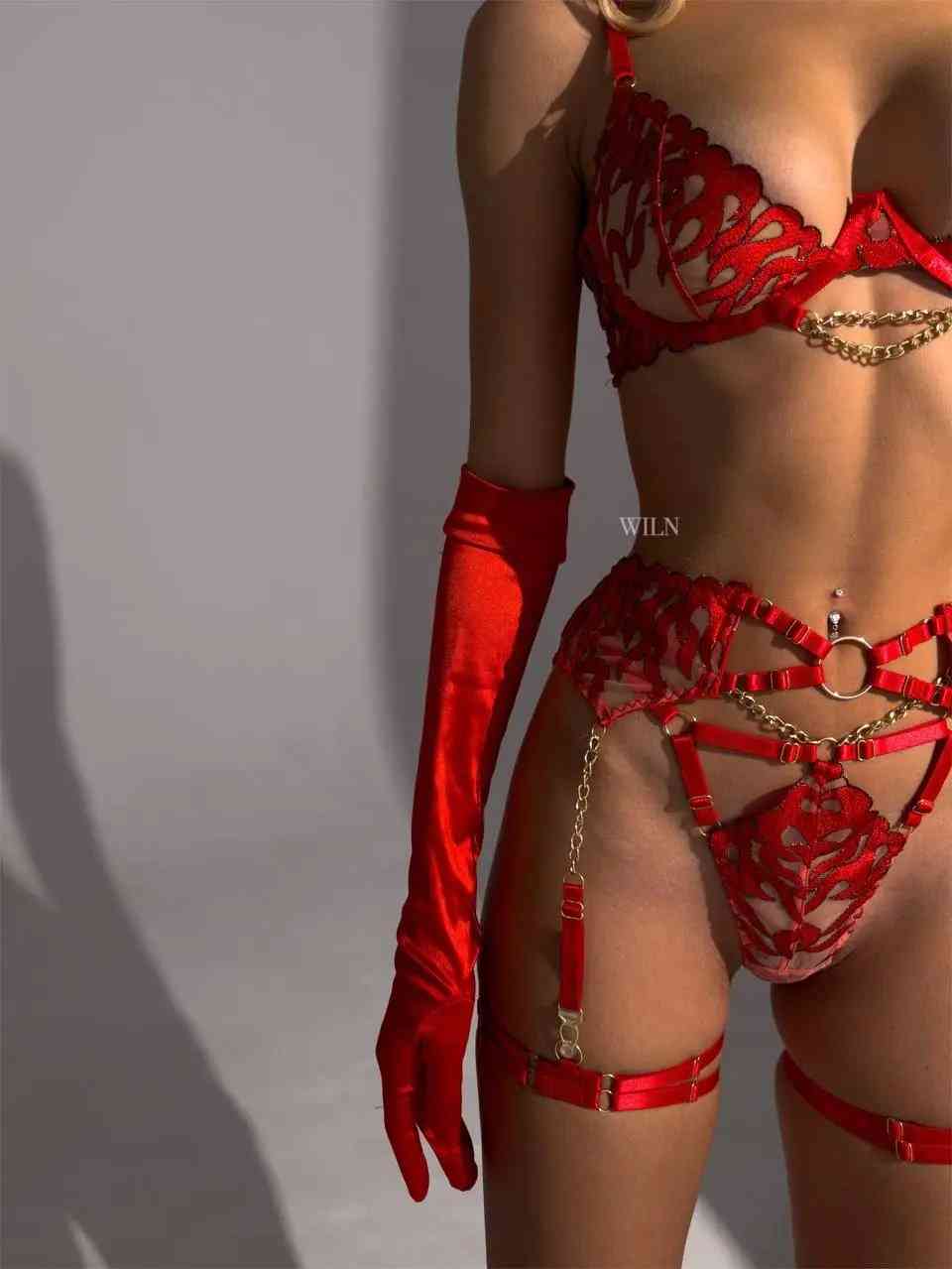 This red 4-piece lingerie set is an exquisite and alluring ensemble designed to captivate and enhance the wearer's allure. The set consists of a bra, panties, and a garter belt, all crafted from a rich, vibrant red fabric adds a touch of passion and intensity. The bra features supportive underwire, enhancing the bust and creating a flattering silhouette. The delicate gold chains drape gracefully over the contours, creating an enticing contrast against the bold red backdrop. To add an extra layer of allure, a red flame mesh pattern is strategically incorporated into the lingerie, creating an intricate and visually striking effect.